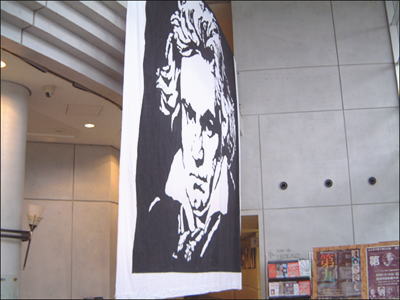 ロビーには、「体育館第九」でお馴染みの巨大な垂れ幕が掲げられていました。ちなみに、写真の右下に小さく写っている2枚のポスターは、この後に行われれる仙台と岩沼での「第九」のものです。 |